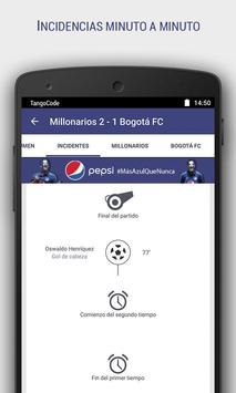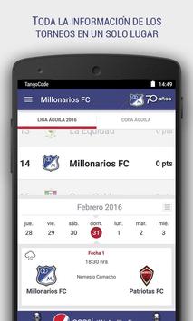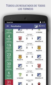 * Live scores and notifications from the different tournaments "Millonarios" is playing such as Apertura, Clausura , Aguila Coup, Libertadores Coup, Sudamericana Coup, etc.