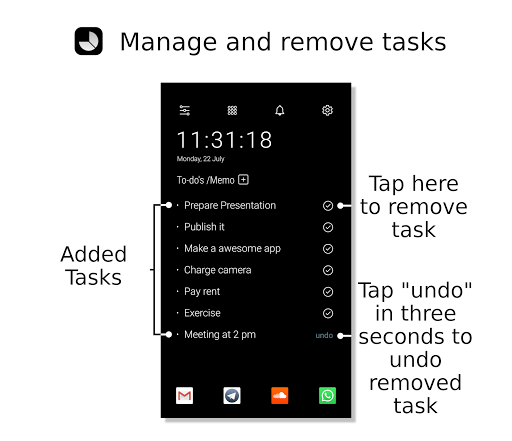 Ok, now when the clutter is gone, you may use our in-built task and memo creator so you can organize your days much better. Remember you have a big screen now free of widgets and apps! It’s a task creator and simple launcher in 1.