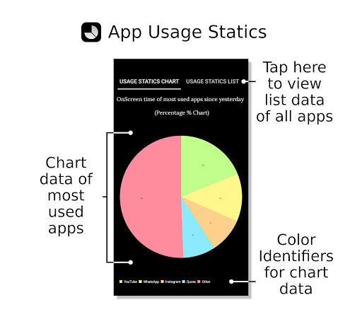 Just swipe right from main screen and easily track app usage statics. Which will help you to find out your apps usage time and most used apps.