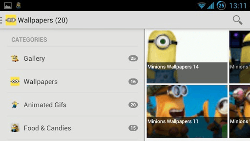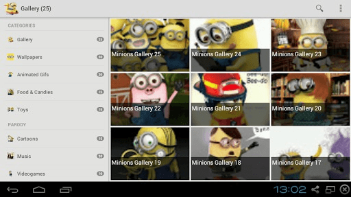 Thousands of Images, Pictures, Photos, Pics, Wallpapers, Parody, Celebrations, Funny Pics and Animated Gifs of the Minions for your smartphone. This app will continue receive update. You can find in this app images of Tim, Carl, Kevin, Stuart, Phil and any Minion more. To save images, click on a picture and you will get a window to save it. PD: Is recommended install the application with the Wi-Fi enabled, this need to load at startup all pictures and categories (this may consume 3G bandwidth). DISCLAIMER: All content in this application found in a "public domain". We do not intend to infringe any legitimate intellectual right, artistic rights or copyright. If you own rights to any of the images, and do not wish them to appear here, please contact me at: pikasdev@gmail.com and they will be promptly removed as soon as possible.
