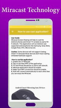 This App simplifies the process to One Click of a button to launch the mircast service on the Phone which in turn searches the near by Smart TV or Wifi Display or display connected to Mircast dongle such as EZcast. After your device discovered you can start the screen sharing.