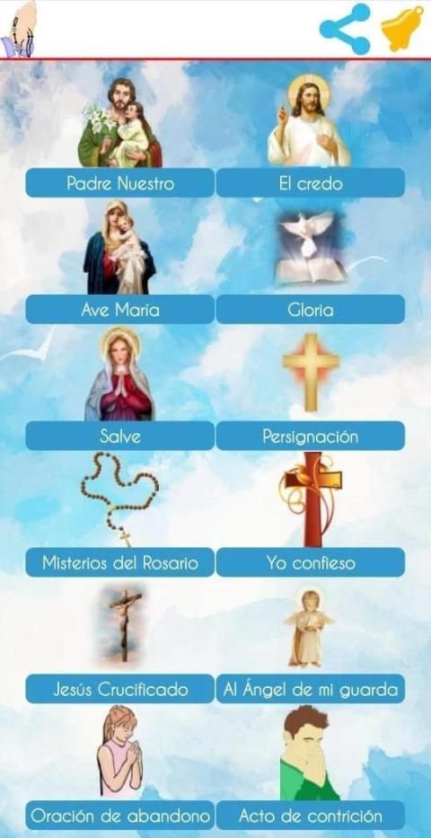 Dentro de ésta aplicación encontrará: el Padre Nuestro, El credo, Ave María, Gloria, Salve, Yo confieso, Jesús crucificado, Al ángel de mi guarda, oración de abandono, acto de contrición, los misterios del rosario (por día), La persignación.