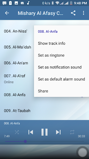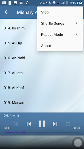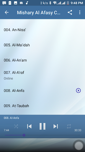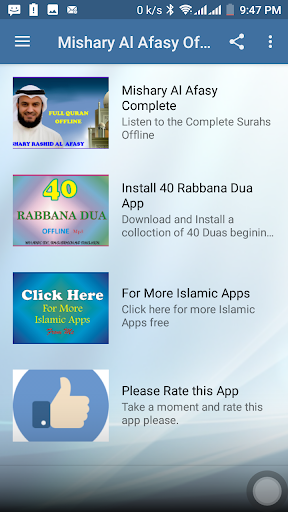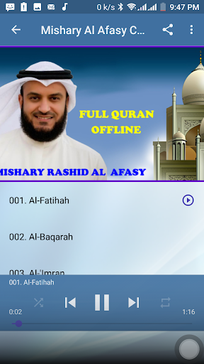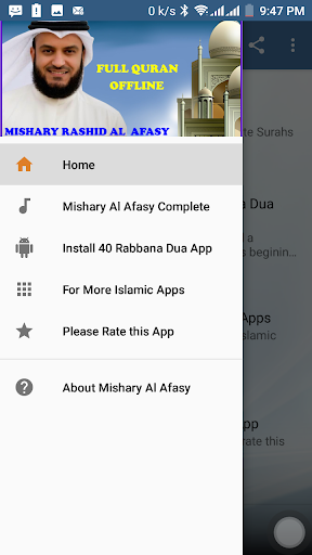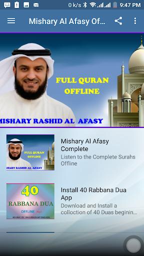 This application brought you Holy Quran mp3 offline recitation by sheikh Mishary Rashid Alafasy. With this application you can listen to any Surah offline for free without the need of internet connection. Download, Install and enjoy the app.