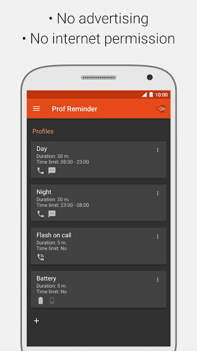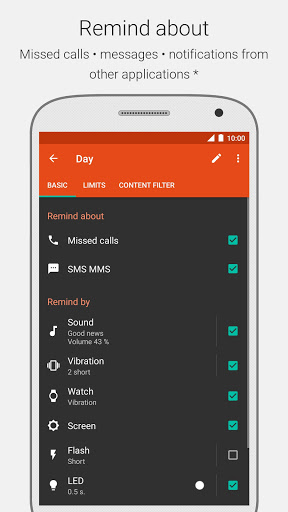 ★ Remind by: sound, vibration, turning screen on, camera flash (not all devices are supported), LED indicator.