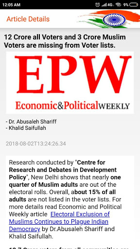 A Research conducted by RayLabs has found 15% of all Voters and 25% of Muslim Voters are not present in Voter lists. So, 12.7 Crores all Voters and 3 Crore Muslim Voters cannot vote in May 2019 Lok Sabha elections. For more details, read the article “Electoral Exclusion of Minorities is a plague to Indian Democracy” by Dr.Abu saleh Shariff and Khalid Saifullah published in "Economic and Political Weekly".