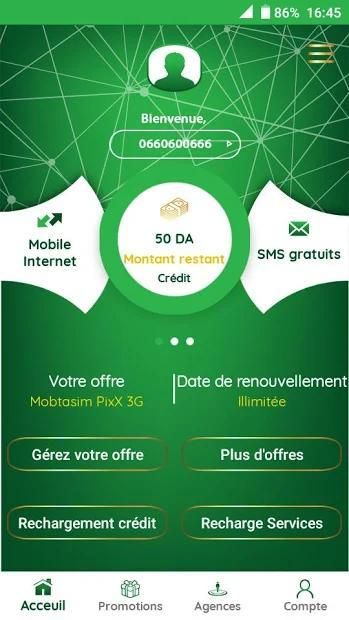 - Reload your credit via recharge card or E-rselli service (via CIB card and EDAHABIA card).