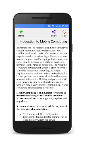 The app is a complete free handbook of Mobile Computing or technology which covers important topics, notes, materials & news on the course. Download the App as a reference material & digital book for computer science, electronics, wireless communication engineering programs & degree courses.