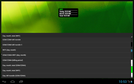 - WiFiGSMCDMA Data usage 2G, 3G, 4G (EDGE, GPRS, HSDPA,HSDPA , LTE), Tethering via WIFI, Roaming, Hotspot - wireless traffic for one SSID, Plan for mobile traffic, Data usage for applications