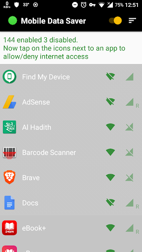 * Tap on the icons next to an app to enable/disable internet access for both Wi-Fi and mobile data