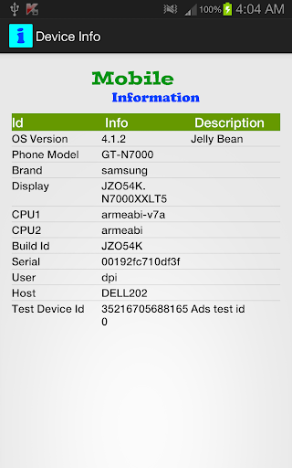 Display your mobile phone device information, e.g Operation System version, Manufacturer, Brand, etc. It also display ADMOB id use for Android Development.