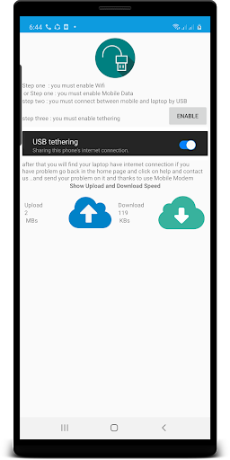 Mobile modem a simple application that shares Internet connection from your smartphone to your computer through usb connection. When you connect the phone to your laptop or computer, the application automatically starts. Then you can easily share Internet access through USB by clicking: Start USB tethering.