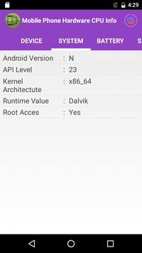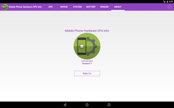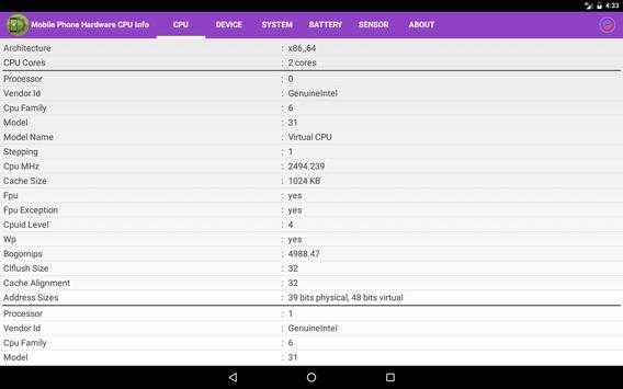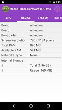 Mobile Phone Hardware CPU Info is a CPU and hardware information, diagnostic and analysis tool for Android devices. Mobile Phone Hardware CPU Info displays detailed information on the CPU,GPU and hardware components of an Android device. It detects the central processing unit, RAM, motherboard chipset and other hardware features of your Android smartphone and presents the information in simple tabs view.