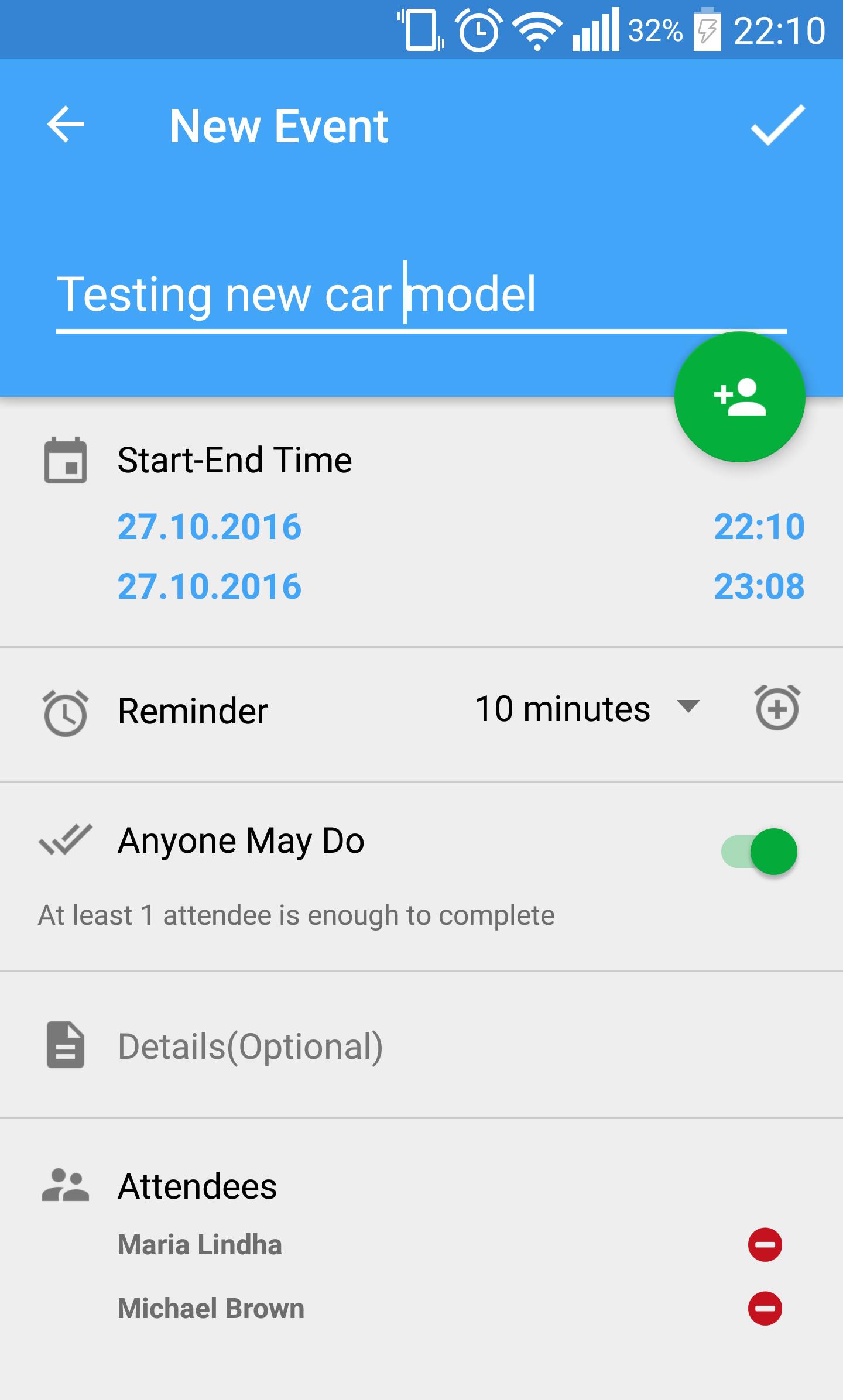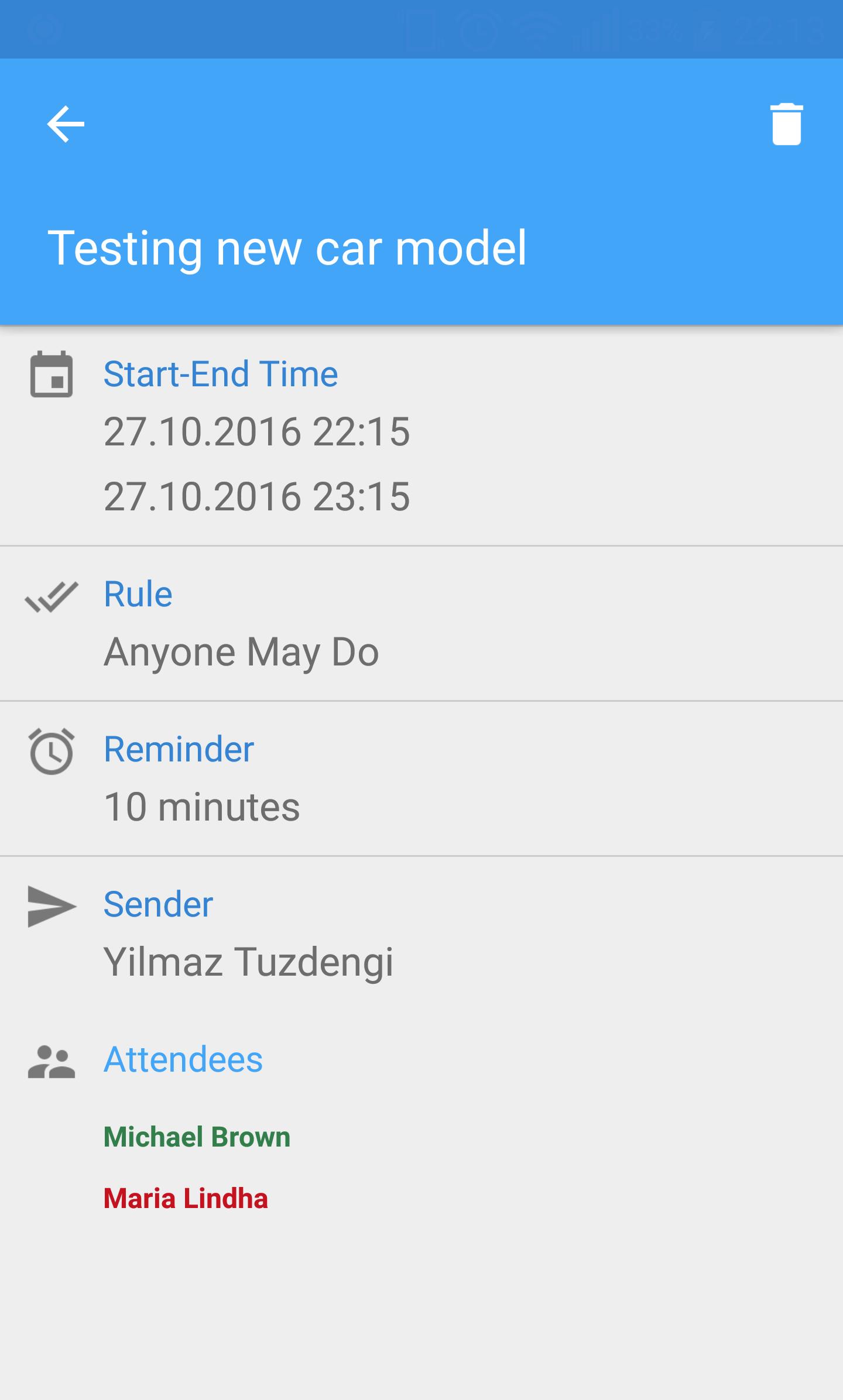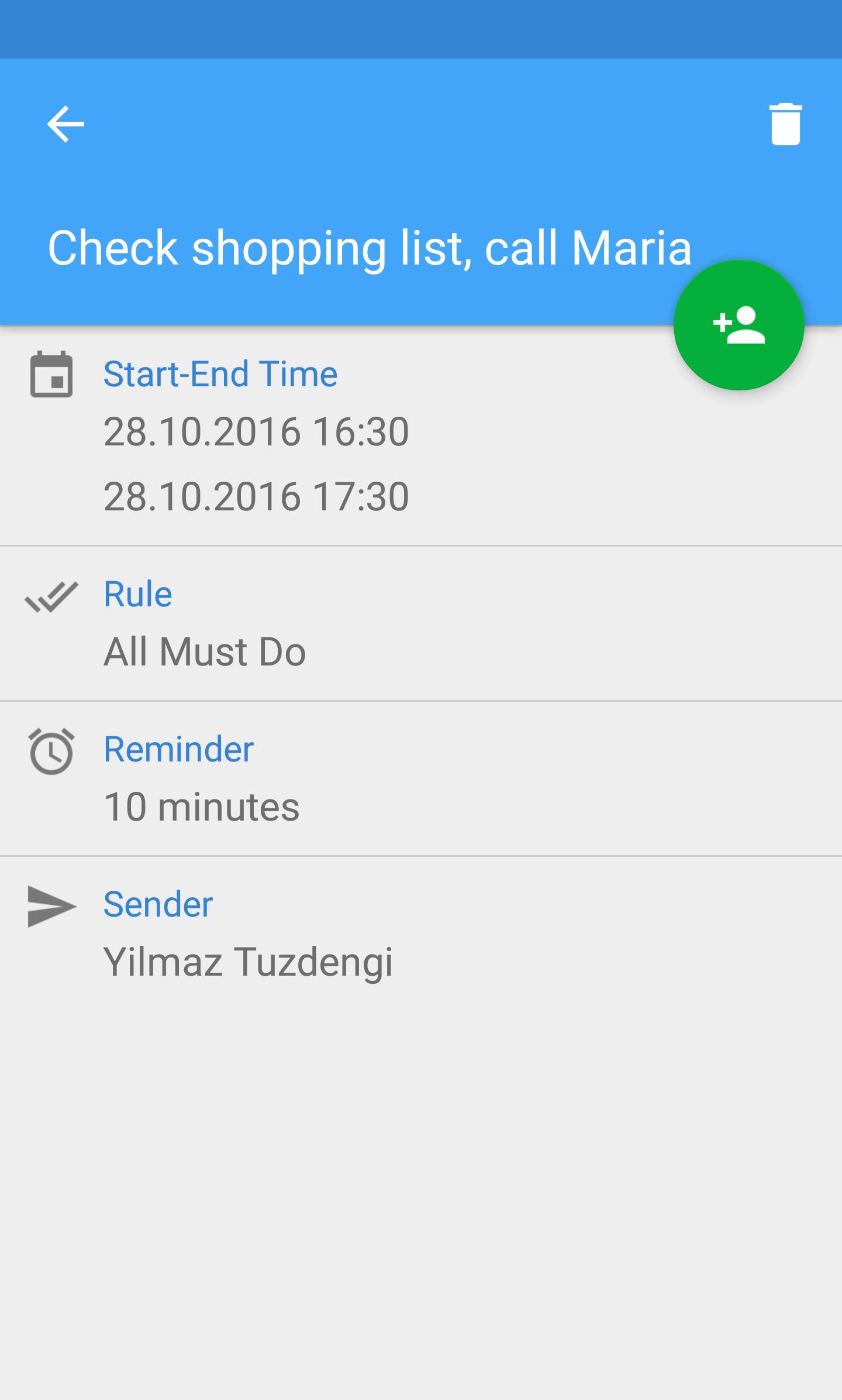 Events and notes can be shared with your contacts. Just invite them! If your friends use Moneo, they’re able to reply your event, you can see all of them’s decisions. Accepted and none-replied events remind all attendees and sender on reminder times via push notifications, rejected events are not notified.
