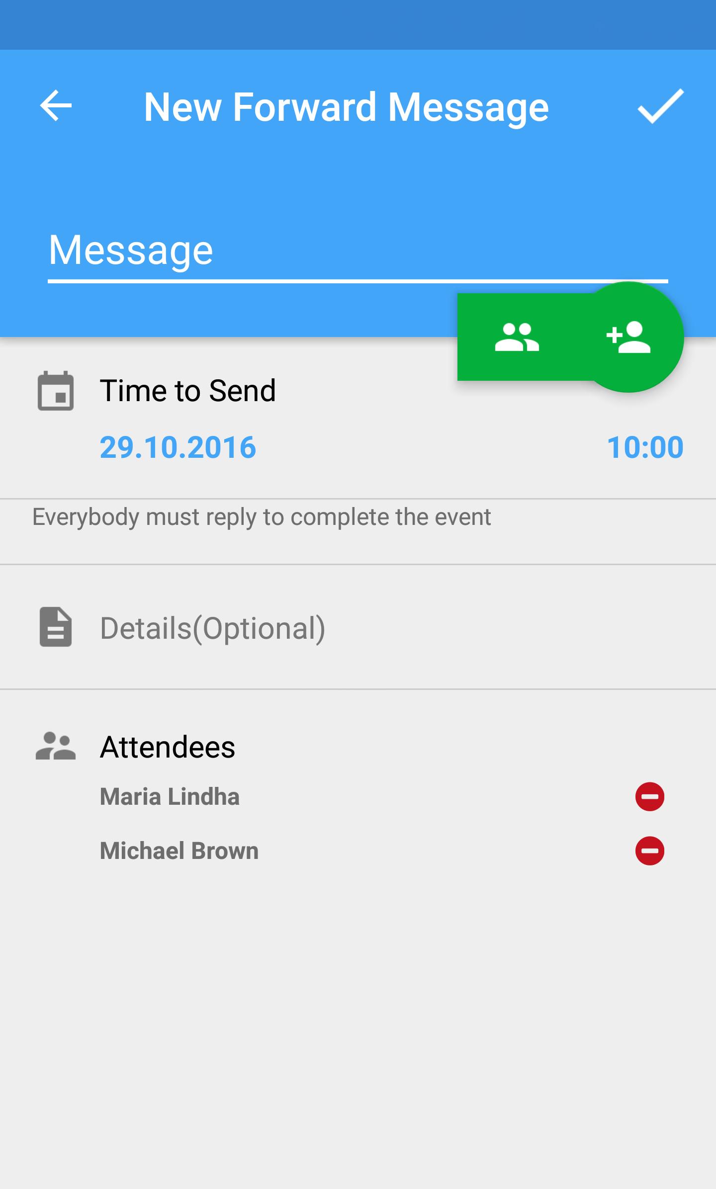 Forward messages are displayed with green arrow. At the dated time, receiver takes a push notification, also display on Event list screen.