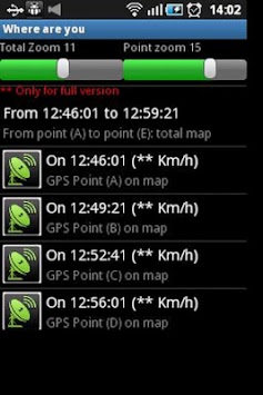 The monitor feature of the application allows to display on the "controller" phone the map of the entire path made by a "controlled" phone in a period of time. On each point of monitored path, it's listed the point type (GSM or NETWORK) and the speed of movement in case of GPS coverage.