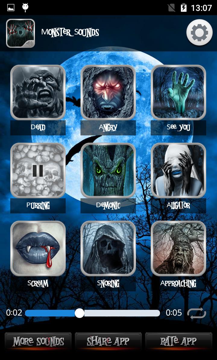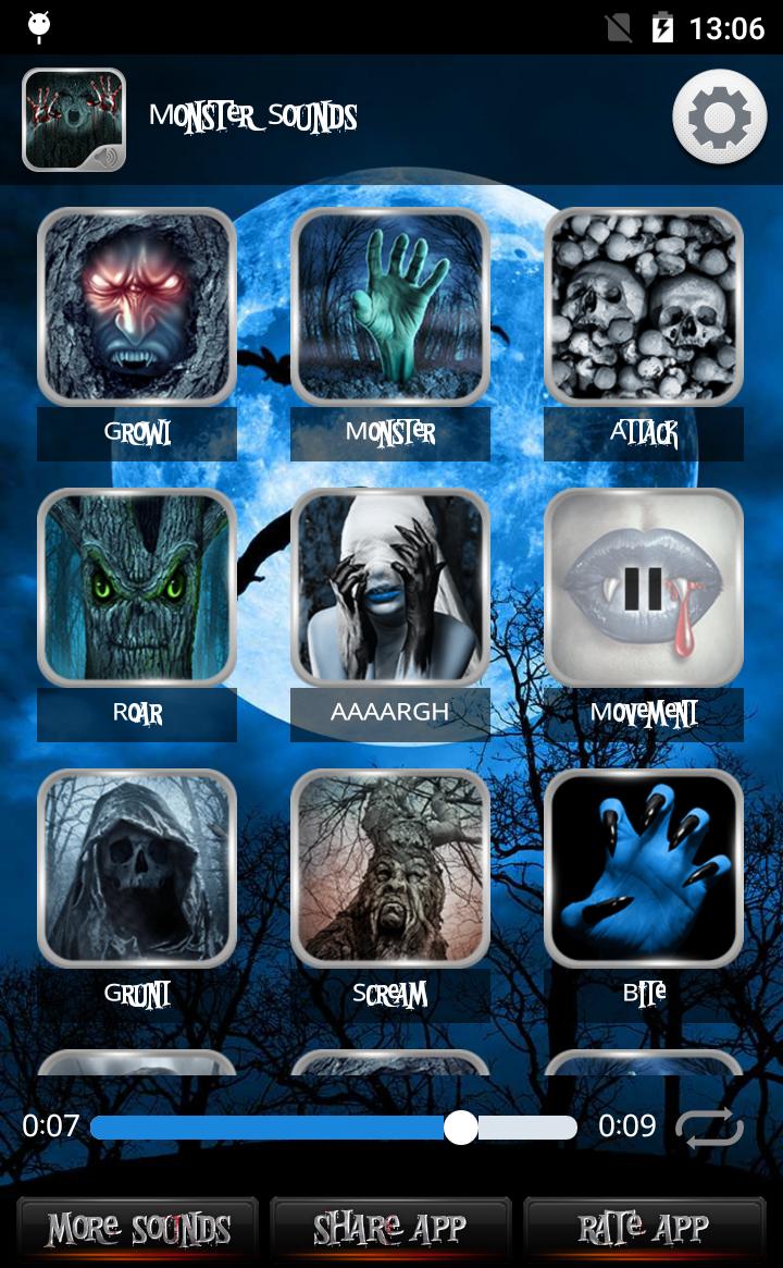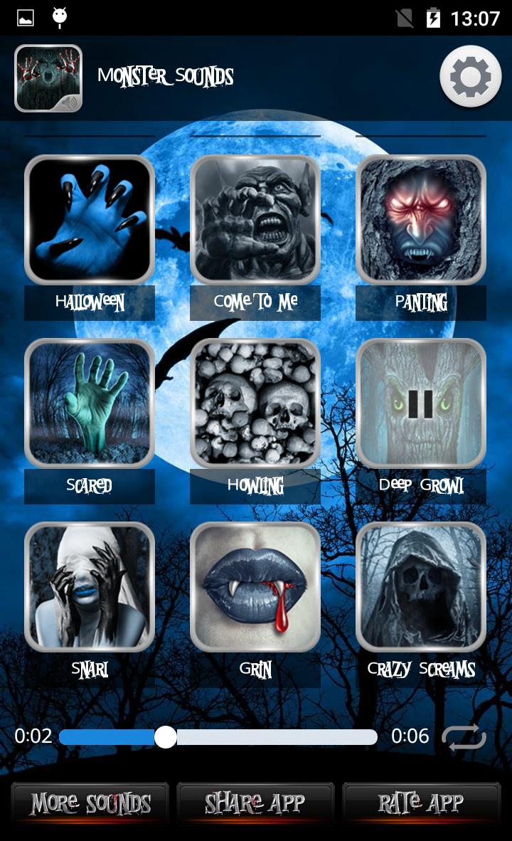 Monster Sounds presents the best collection of the most petrifying tones for your thrill and spooky fun! What we have here is the sum of the scariest ringtones, sinister SMS notifications, but also loud and frightening alarm sounds. You will find some of your favorite evil monsters from all kind of horror fantasies. Enjoy the scary sounds and download these horror ring tones now, completely free of charge. Prepare to be terrified like never before with the scariest Monster Sounds!