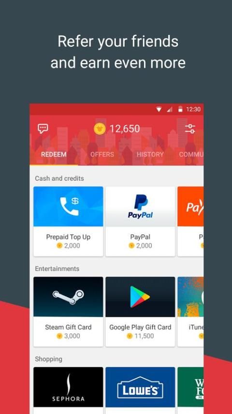 Install free apps and games (blue offer), visit a page (orange offer) or watch a video (red offer).