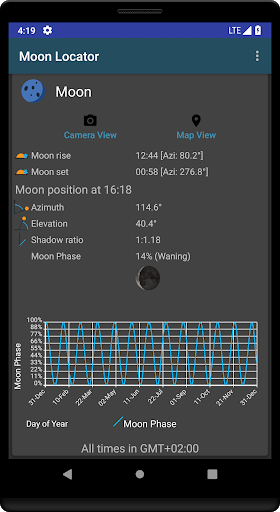 ★ The Main View displays all the detailed information: moon rise and moonset, moon phase (waning and waxing, in percentages) and more. The graph displays the moon phases over the course of a year.