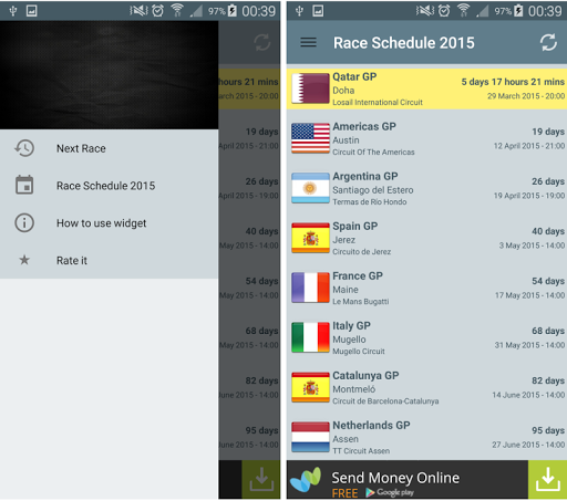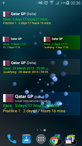 You can add several countdown widgets to your home screen and you can easily customize them at the creation or later by tapping flag icons. If you touch anywhere else in the counters you can see the dates, details and map of the next Race.