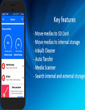 This application "Move To SD Card New" is a quick arrangement to transfer files from the internal memory to the SD card of your phone. In one click, you free the space in the internal memory of your phone.