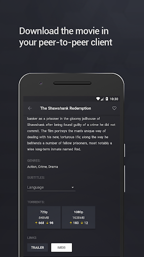 The app provides a sublime overview of all the available movies, you can click on the movie to get some details about that movie. The details screen shows an option to get the magnet link and open it in a peer-to-peer client.