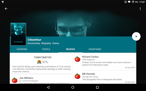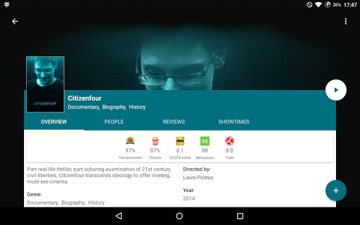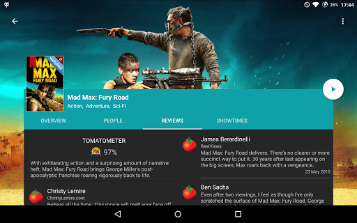 Movie Mate lets you find movies, ratings, reviews, showtimes and more available on Tratk.tv, TMDb, Rotten Tomatoes, IMDB and Metacritic.