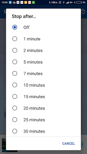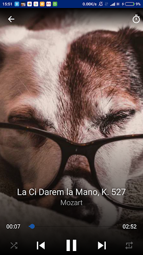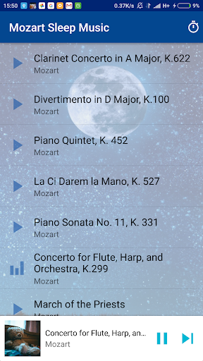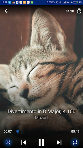 The app has timer, you can set it and go to sleep, the music will be stopped automatically. The app has shuffle mode to play music in random order and repeat mode to play the same song again automatically.