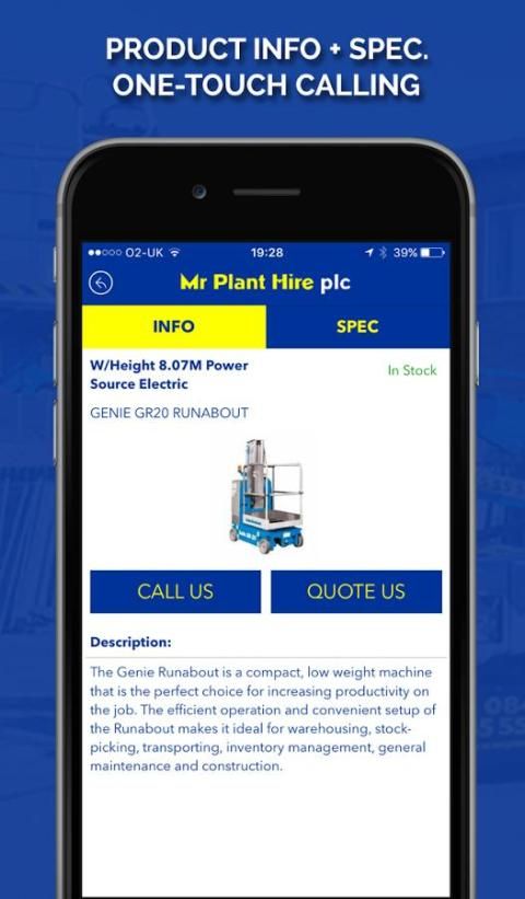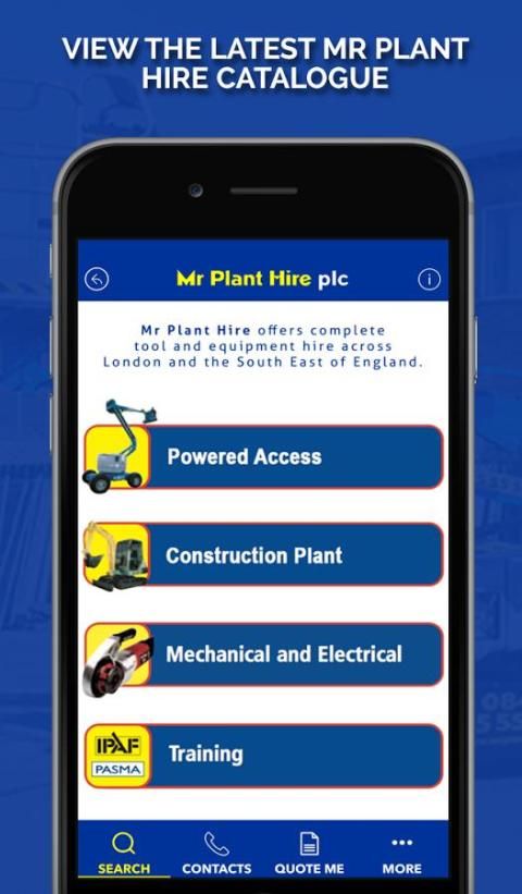 Discover the world of Mr Plant Hire Plc. at your fingertips. You can explore our full range of plant products available for hire straight from your device, as well as accessing the latest spec sheets, operator manuals and point loadings. Try the great quote feature and receive a 30-minute call back on the go!