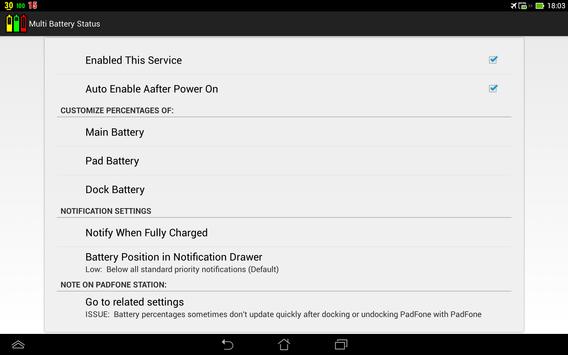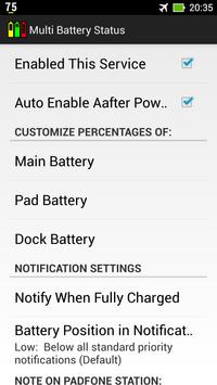 Note that in order to update battery percentages after docking or undocking PadFone, "Multi Battery Status" must be added and checked in "Settings" -> "ASUS customized settings" -> "PadFone Settings" -> "Dynamic Display list".