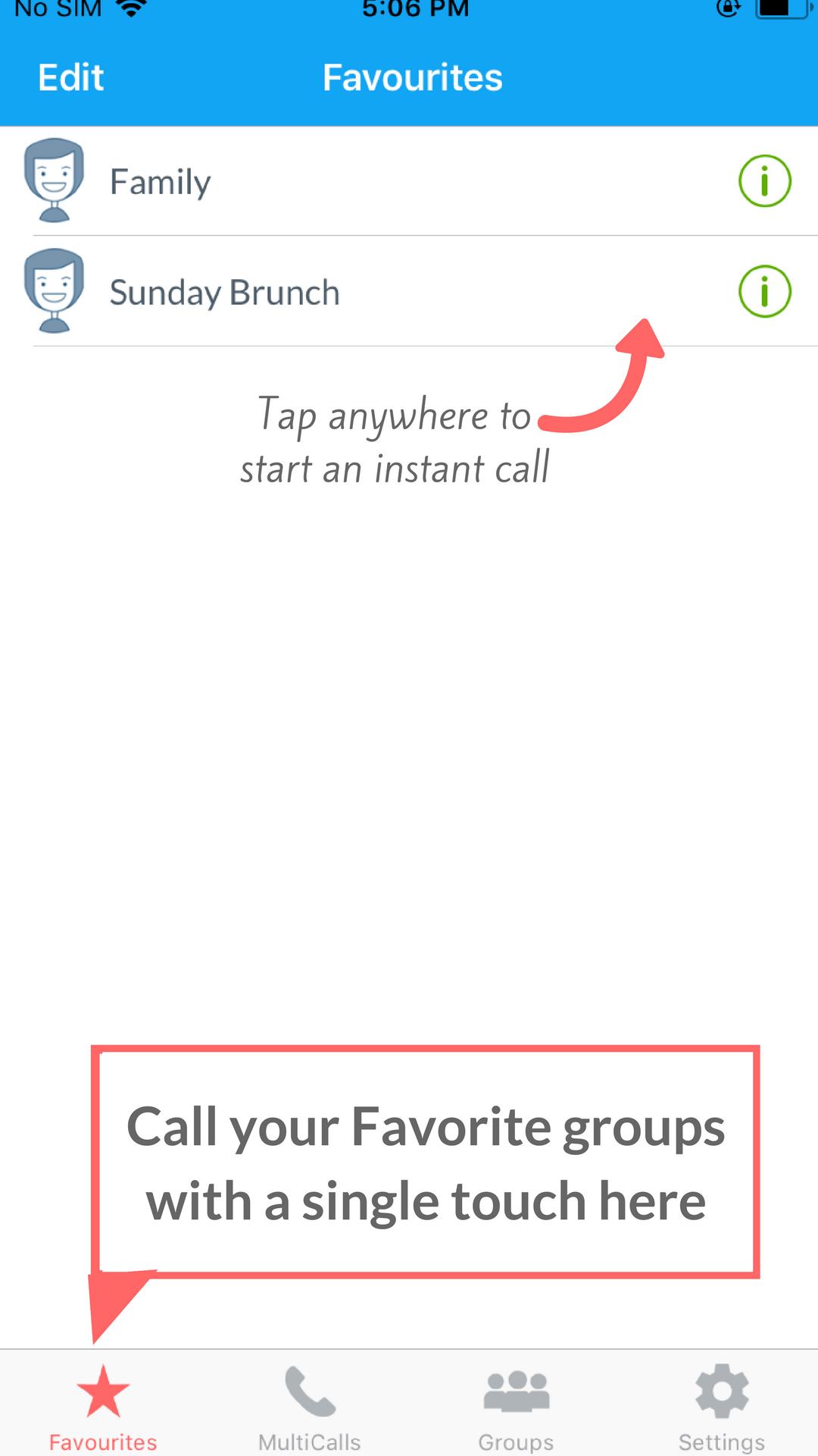 However, with MultiCall, you can start a group call instantly or scheduled calls from your phone. Simply select the contacts and press ""Call"". Your participants will receive a call from our server and get connected instantly on the instant calls. No waiting, no PINs!