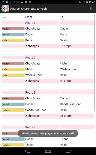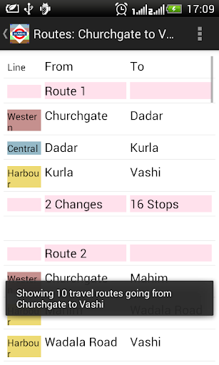 The search provides you with a list of alternative routes which can be used to travel from the source to destination station. It provides you with the number of line changes and station stops involved in each route. The results are displayed based on your chosen sort option.