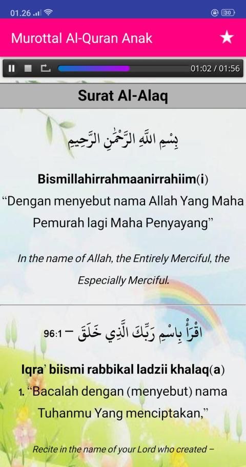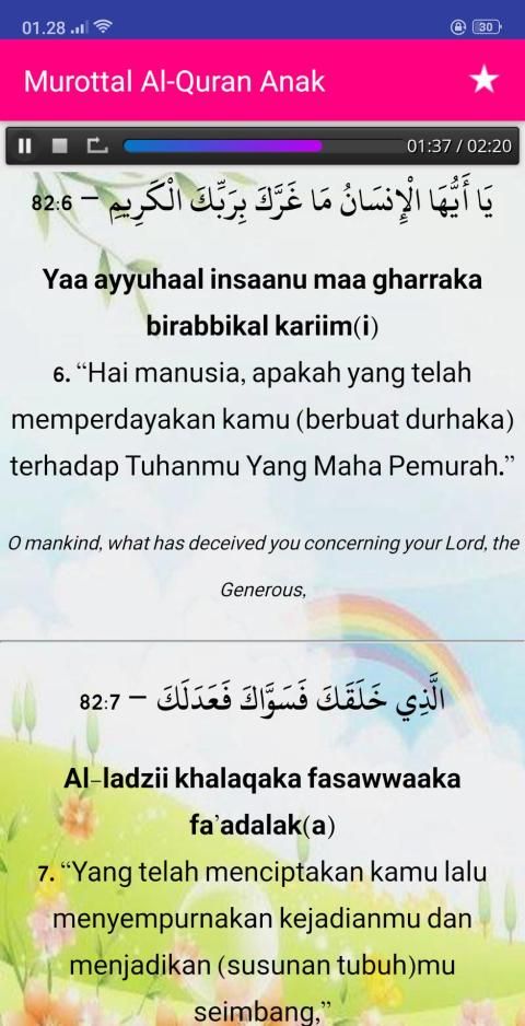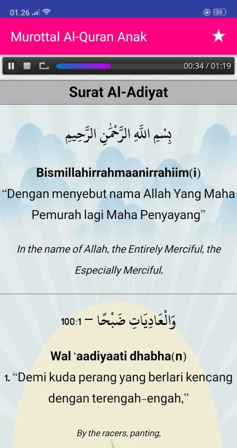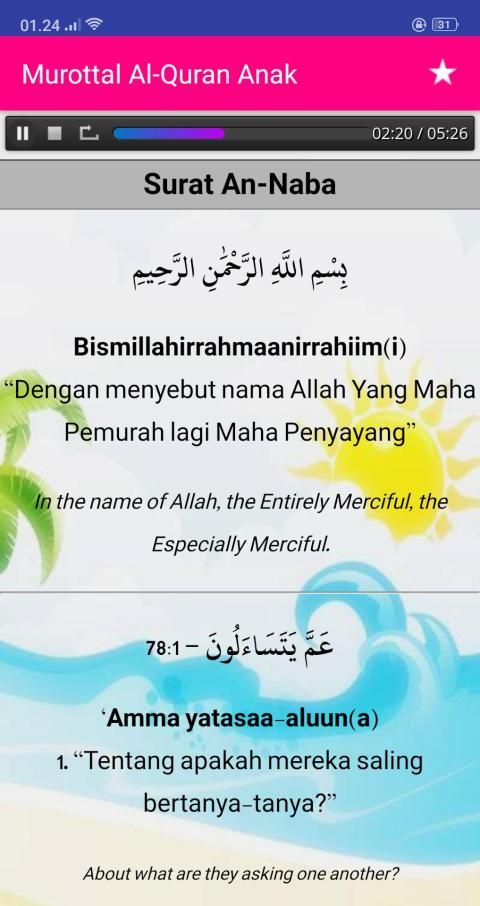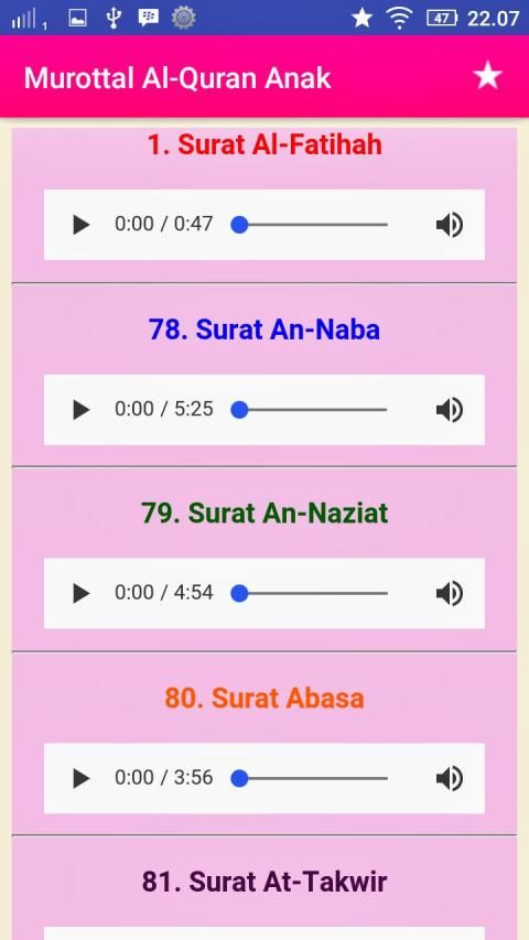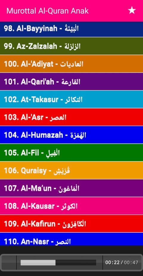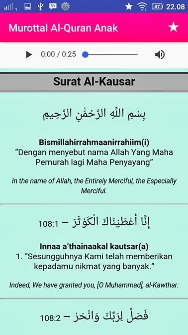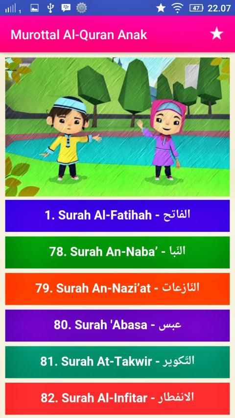Murottal Al-Quran Kids Offline (Juz 30) - Complete with Surah Readings in Arabic, Latin & Translation Text. Suara Audio (MP3) by Little Qari "Muhammad Thaha Al-Junayd". Is the most interactive murotal Al Quran application, made with a unique and colorful design, so that it fits and attracts children. Fast and lightweight application, and very simple and easy to use. Equipped with translations (Indonesian - English) and murottal.