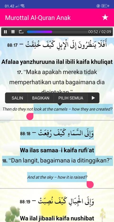 Aplikasi sepenuhnya offline dan tidak membutuhkan koneksi internet sama sekali, termasuk untuk mendengarkan murottal-nya. Dibuat untuk memudahkan anak ketika belajar membaca, mengaji dan menghafal surat surat pendek yang ada dalam Al-Quran. Semoga membawa keberkahan dan bermanfaat bagi semuanya.