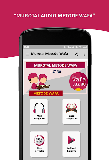 Murotal Metode Wafa / Tilawah Metode Wafa adalah aplikasi yang membantu anda untuk belajar Al-Qur'an dengan mendengarkan audio Metode Wafa/Tilawah Wafa. Pada Wafa sendiri terdapat Tilawah wafa 1, Tilawah wafa 2,