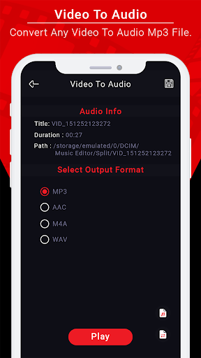 The most powerful and complete Music Editor - MP3 cutter ! It has all the features you would ever want in a Music Editor!! Split Audio function allows you to quickly split any audio file into two parts. Convert any video files to many formats including mp3, wav, m4a and aac etc.