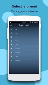 - Equalizer presets : Acoustic, Bass Booster, Bass Reducer, Flat, Classical, Hip Hop, Rock, Latin, Pop...