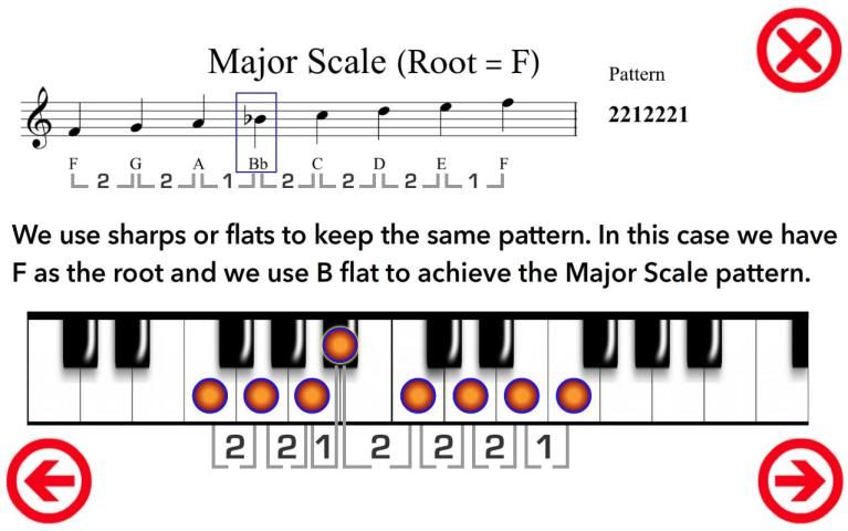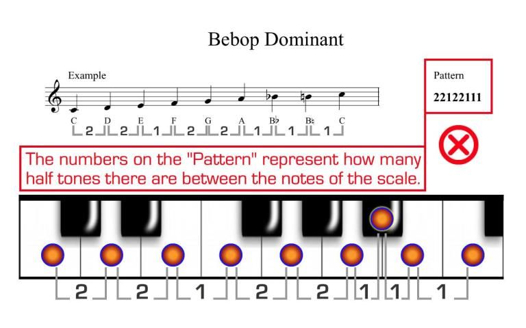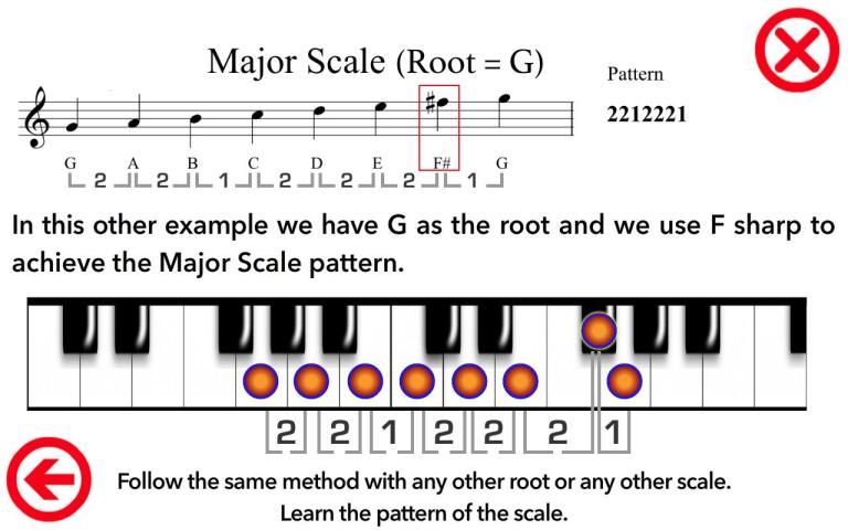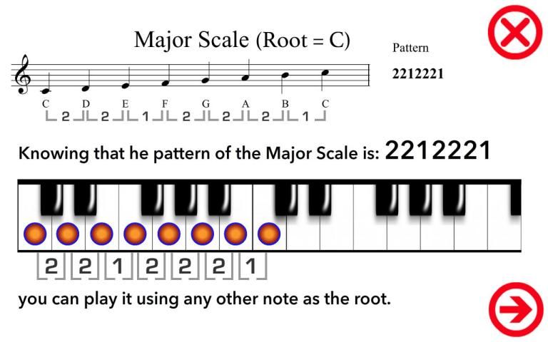 - It shows the musical notation and the “PATTERN” of each scale. The “PATTERN” is the amount of semitones between the notes of a scale.