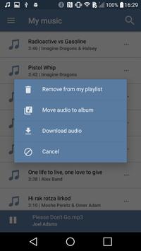 My dear users! Unfortunately, from 16th Dec 2016 VK does not provide anymore ability to listen to music from 3rd-party applications. I'm looking for another solutions. Thank you for your patience.