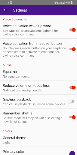 Musica player's speech recognition accurately detects your voice commands. To give voice commands, tap on the button with the microphone symbol on the bottom-right side and speak when it turns red. You may also say wake up word instead of tapping on mic button for hands free operation in Pro version. Not only you can play songs but also control music playback by speaking the following commands: