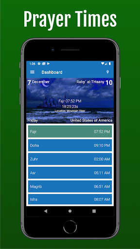 • Displays the times of Fajr, Sunrise, Dhuhr, Asr, Sunset, Maghrib, and Isha.