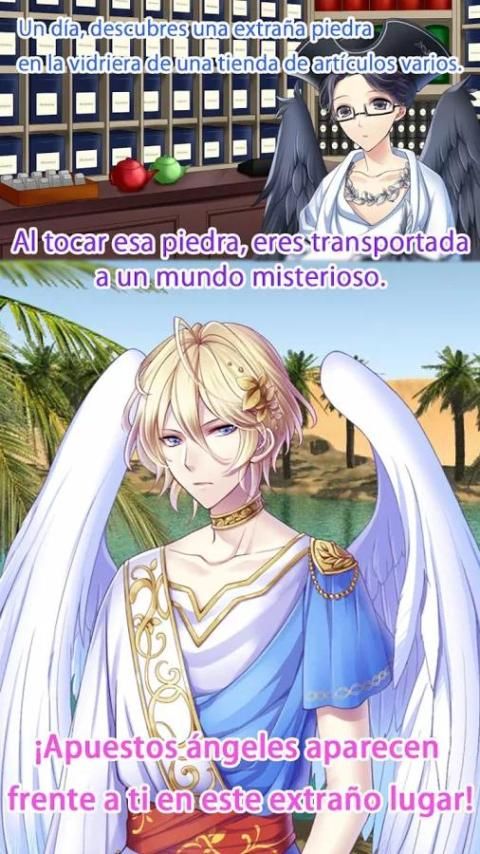 One day, while walking through your city, you discover a strange stone in the window of a convenience store. By touching the stone, you are transported to a mysterious world. Handsome angels appear in front of you in this strange place and discover that enemy forces want to hurt you. The Angels need your help to defeat the Archangel traitor Lucifer! You choose one of the four angels to protect you during your adventures. Will you be able to defeat the archangel Lucifer and return safely to your own world?