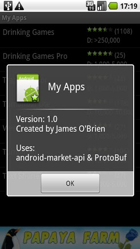 This application allows developers to view the current status of their own applications in the android market. After entering your publisher name, the application will automatically gather information on each of your apps and show an alert for any new ratings
