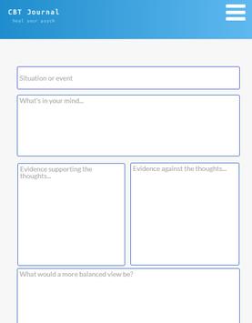 Cbt Journal is a simple tool to write and overcome anxiety situations. It's inspired by cognitive-behavioral psychotherapy that helps you remedy anything that may unconsciously block you to achieve your goals.