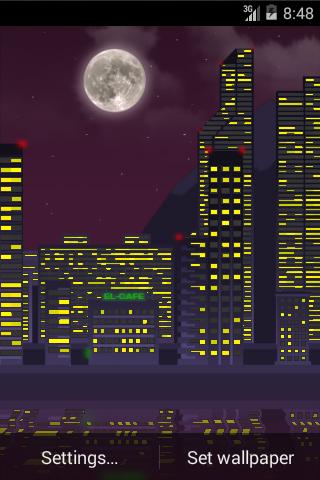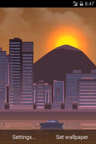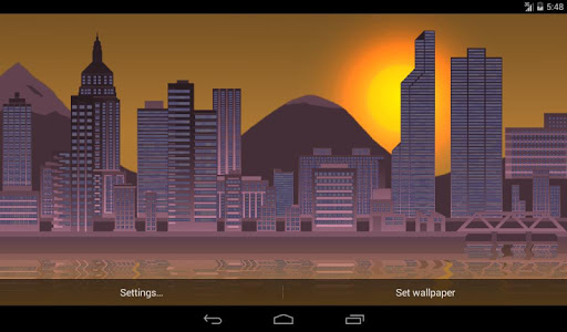 Multilayer pixel art live wallpaper. Live elements include both automatic time of day changes and automatic camera - for which you can choose direction. The colors of the day during the change smoothly. The windows illuminate light when night falls in the town.