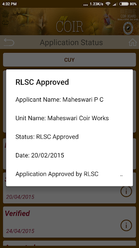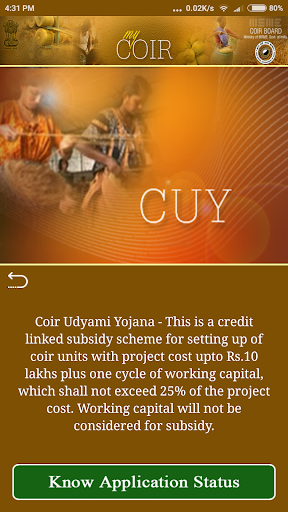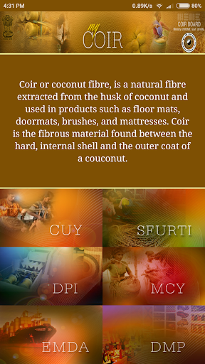 My Coir App gives a brief description of various Coir Beneficiary Schemes to help and assist entrepreneurs, especially small businesses, which are implemented by Coir Board, Ministry of MSME, Government of India. My Coir App is useful for beneficiaries to know the status of their submitted Applications. The App is designed, developed by Mobile App development Competence Centre, National Informatics Centre