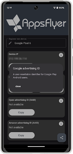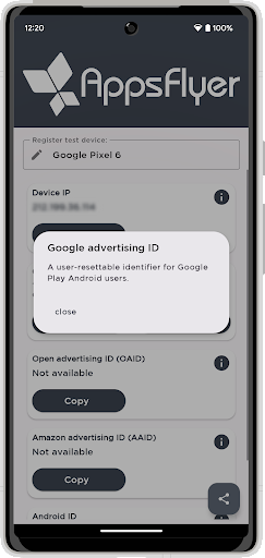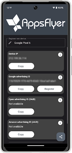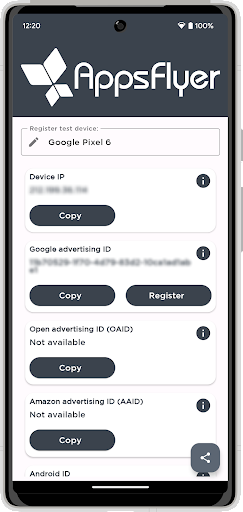 Use My Device ID to directly register test devices and test AppsFlyer SDK integration within your app.