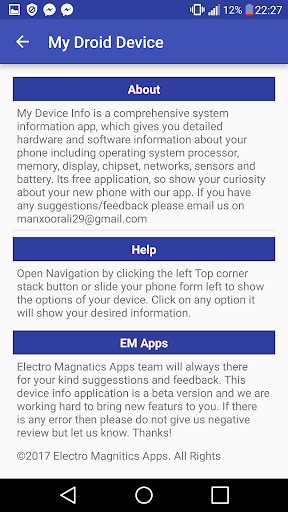 My Device Info application is all about your phone. It gives you the exact details you want. This application is designed so that all the information of your device will show to you in one place. There is no more need to open settings and search for your desired information about your phone. This application will reach to your hardware and get all the information. All the information is shown to the user are user friendly and easily accessible. The app give you the information about following main features: