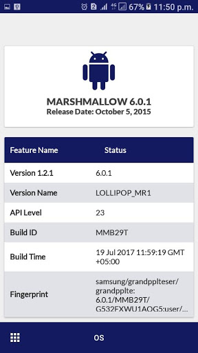 Operating System(OS) Info: Version, Version Name, API Level Build ID, Build Time, Fingerprint etc
