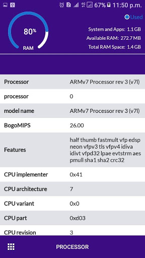 Processor info: Processor, Bogo MIPS, Features, CPU Implementer, CPU Architecture, CPU variant etc.