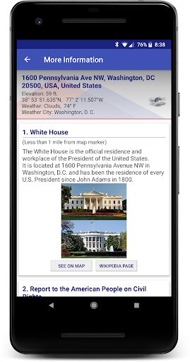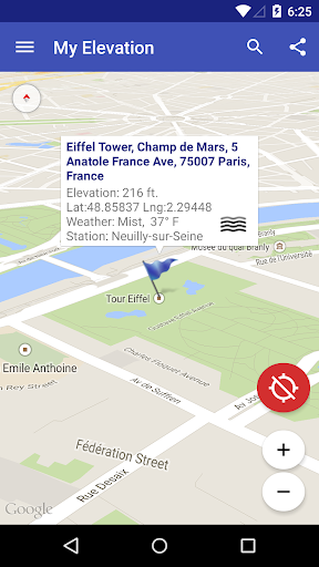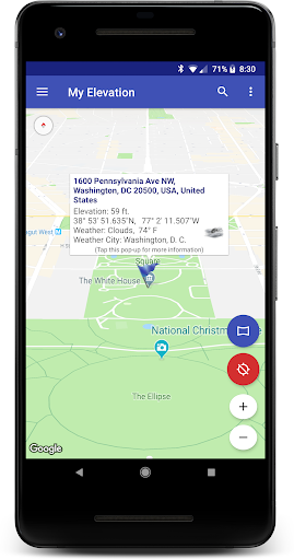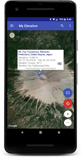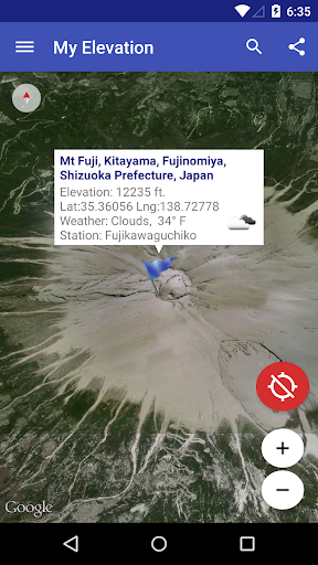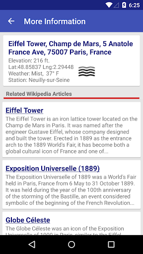 ● Long press a location on the map and My Elevation will tell you the weather there and let you browse Wikipedia articles about attractions nearby the location.